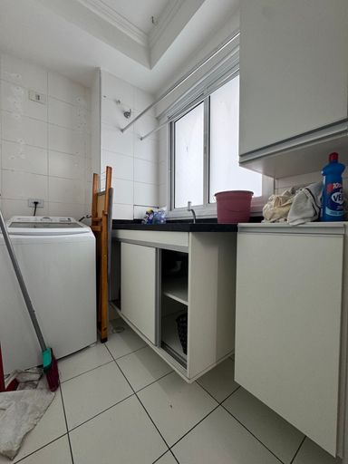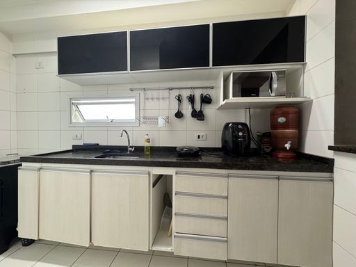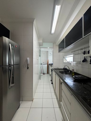 - Cozinha equipada com armários planejados e espaço para geladeira