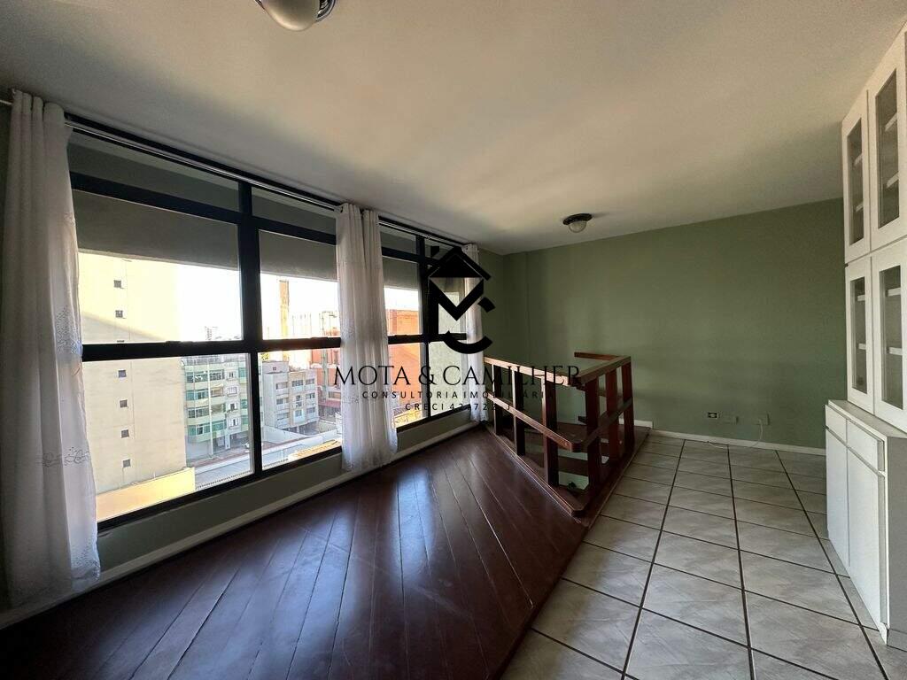 Apartamento Duplex no CentroNo piso inferior: sala 2 ambientes, lavabo, cozinha planejada, área de serviço e varanda. Piso superior: ampla suíte, que pode ser convertida em 2 dormitórios e o wc completo (banheira, aquecedor e gabinete). Ar condicionado nos 2 pisos, edifício muito bem cuidado e administrado, somente dois apartamentos por andar, sol da manhã. Excelente localização ! Estuda permuta por apartamento de maior valor. Agende já sua visita!